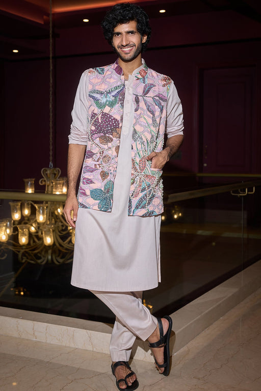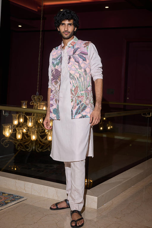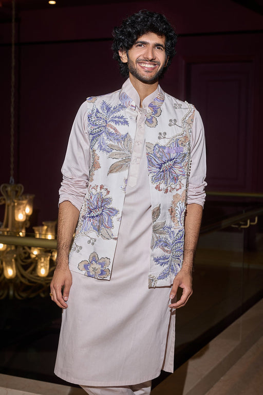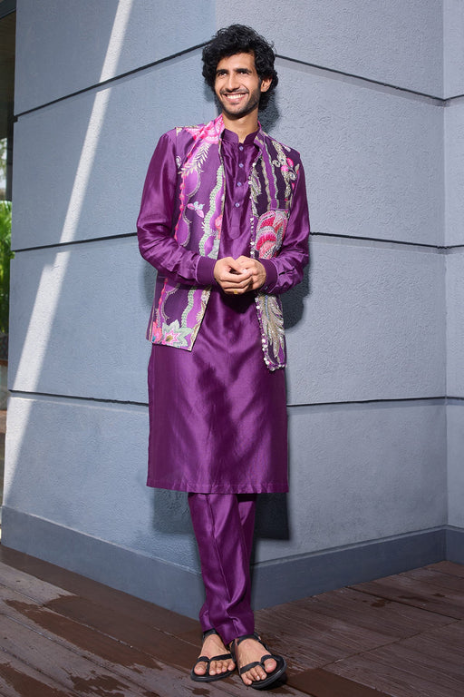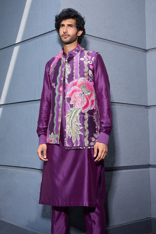 Kurta Set Paired with Hand Embroidered Bundi FABRIC: Glazed Cotton/Chanderi COLOR: Grapevine NO. OF COMPONENTS: 3 DELIVERY TIME: 5 Weeks ...