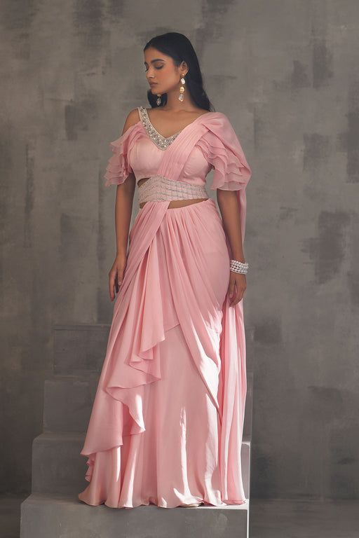 Featuring here a two-piece co-ord set with organza pleated attached stole. This comes with an embroidered belt