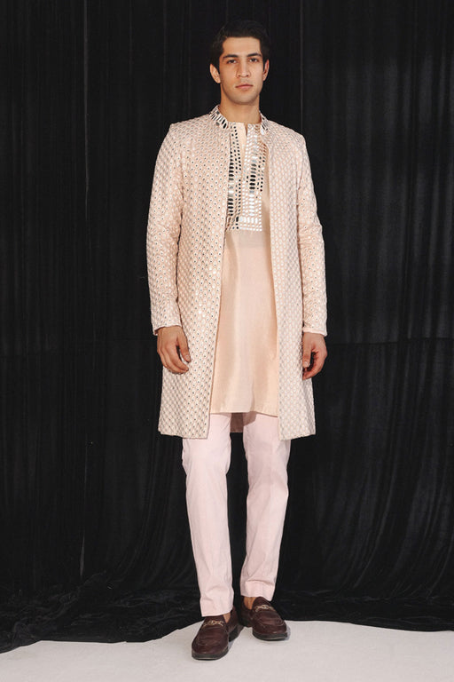 View full detailsBlush Pink Kurta With Mirrorwork Color: Blush Pink Fit: Comfortable Fit Fabric: The garment is made in Silk, with Mirrorwork embroidery designed, ...