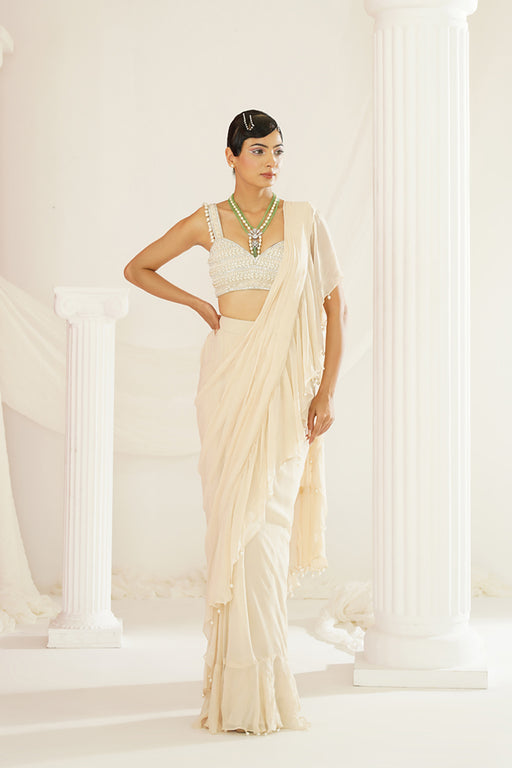 View full detailsKapda Dori's stunning ivory ready to wear ruffle saree, beautifully adorned with intricate pearl details on ruffle pallu. The ivory color adds a to...