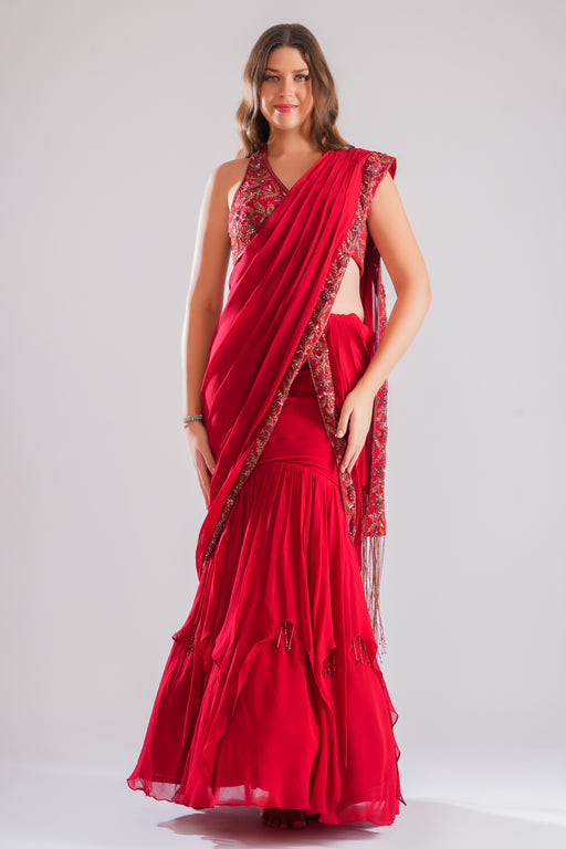 Pre-Drape Mermaid Saree – A stunning fusion of traditional and contemporary design, crafted from georgette in a bold red hue. The mermaid silhouett...