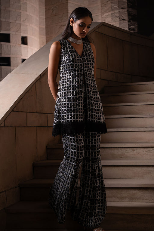A graceful long A-line kurta paired with palazzos and a silk organza dupatta. The kurta features a zero neckline with placket and three-quarter sle...