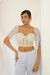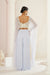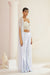 Kapda Dori's stunning Powder blue armani satin fabric flared pallazo, beautifully adorned with pearl detail on belt. The pallazo features a full-length flared look. The Powder blue color adds a touch of glamour and sophistication to your look, while the fabric texture ensures you feel comfortable all day or night long. It is styled with a blush pink satin corset blouse adorned with hand embroidery with pearls, crystals, sequens and long flared sleeves.