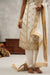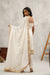 Kapda Dori's stunning banarasi geogratte booti churidar set. The ivory color adds a touch of glamour and sophistication to your look, while the fabric ensures you feel comfortable all day or night long. It is styled with white banarasi geogratte booti kurta beautifully adorned in cutdana, pearl, sequins and stones work. Pair it with complimenting geogratte dupatta finished wth gold sequins lace.