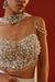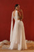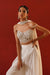 Kapda Dori's stunning white geogratte sharara. The white color adds a touch of glamour and sophistication to your look, while the soft fabric ensures you feel comfortable all day or night long. It is styled with a white net blouse hand embroidered with beads, pearls, stones and sequins. Pair it with complimenting white chokar geogratte dupatta.
