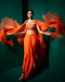 Description: This is a drape skirt set with a ruffle cape in persimmon orange color. Paired up with a heavy cutdana embroidery work to give an enhanced look.