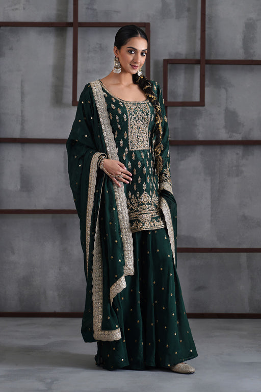 This 3 Piece Sharara Set Comes With Mirror, Zardosi And Tikki Embroidery On The Collar And Kurta-Patti. It Is Enhanced With Tikki And Mirror Butis ...
