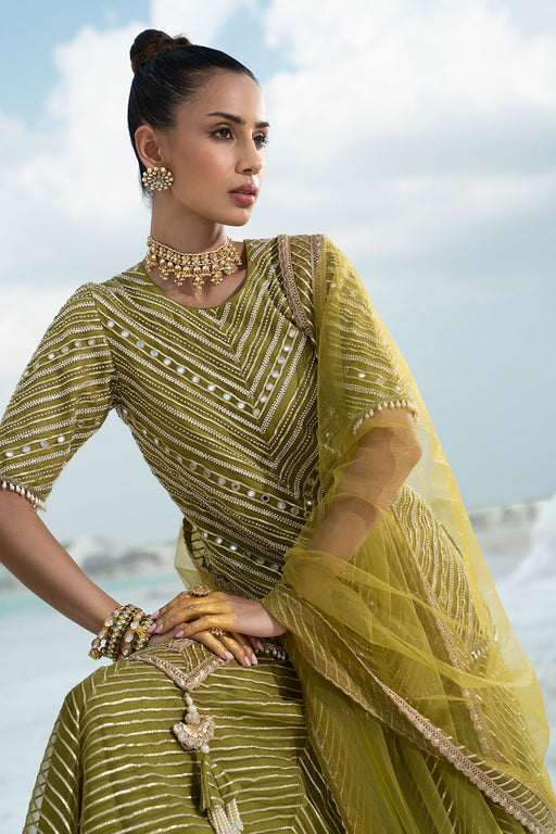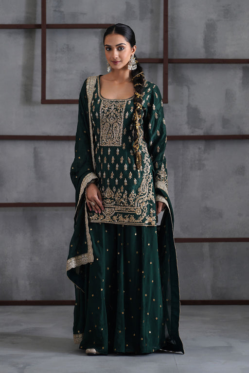 View full detailsFeaturing sage green patra and zari work short kurta jacket with sharara comes in geogette