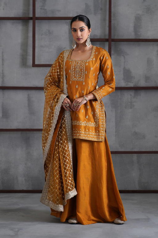 View full detailsDeepika Chadha's stunning Mustard and gold silk fabric kurti, beautifully adorned with intricate pearls , stone and sequins embroidery. The flowy m...
