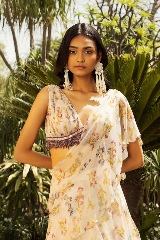 View full detailsDescription: Crafted in opulent tissue fabric , the saree Features a captivating scalloped cutwork border. The intricate pitta and cut dana embroid...