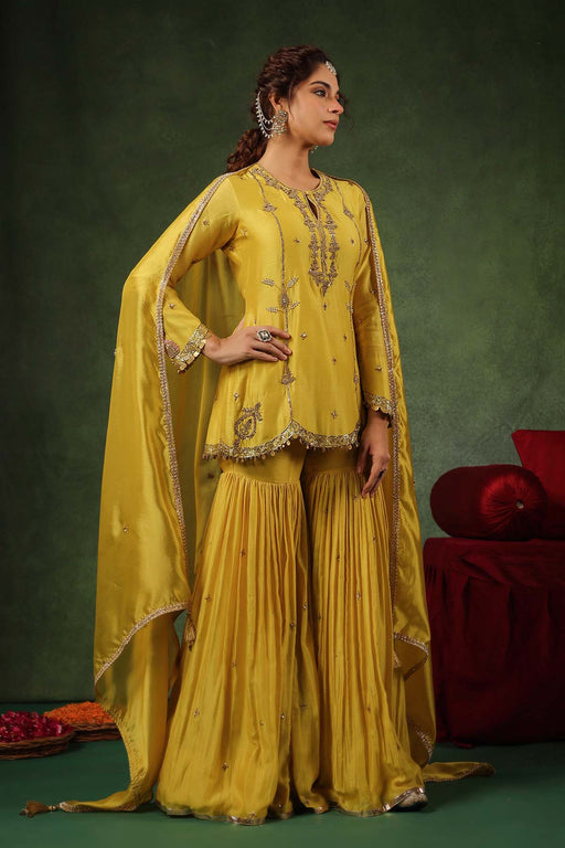 View full detailsThis 3 pc sharara set comes with heavily emboidered zardosi neckline and hem of the kurta. It is embellished with zardosi butis spread over the kur...