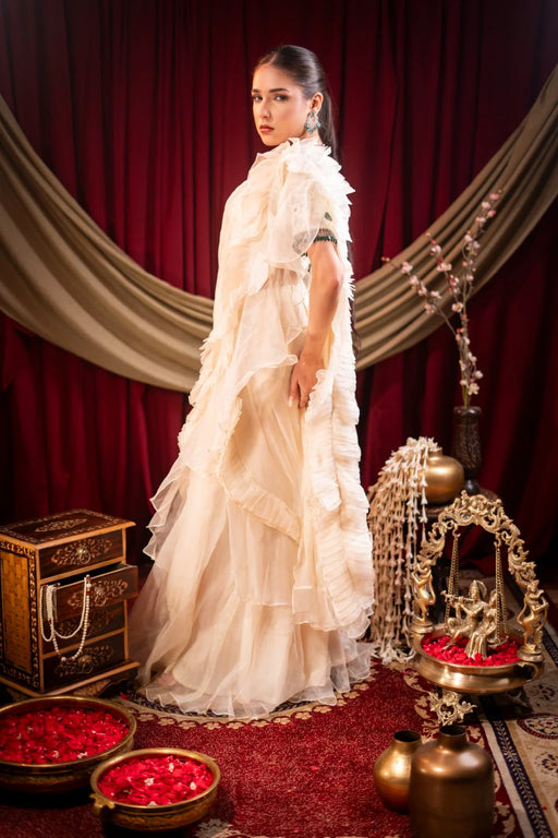 View full detailsWave Structure Hand Embroidered Cape Set With Cowl Drape Detailing On Cape Back: Blouse Has Tie-Up Closure Detailing At Back, Skirt Waistband Is Ac...