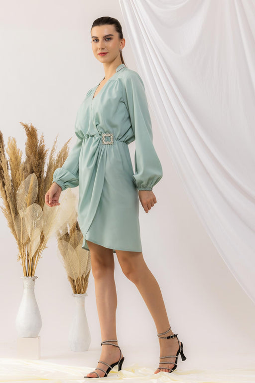 View full detailsThis dress in american crepe features an elasticated waist with crystal buckle on the side. Embellished with diamanté at the band of the neckline