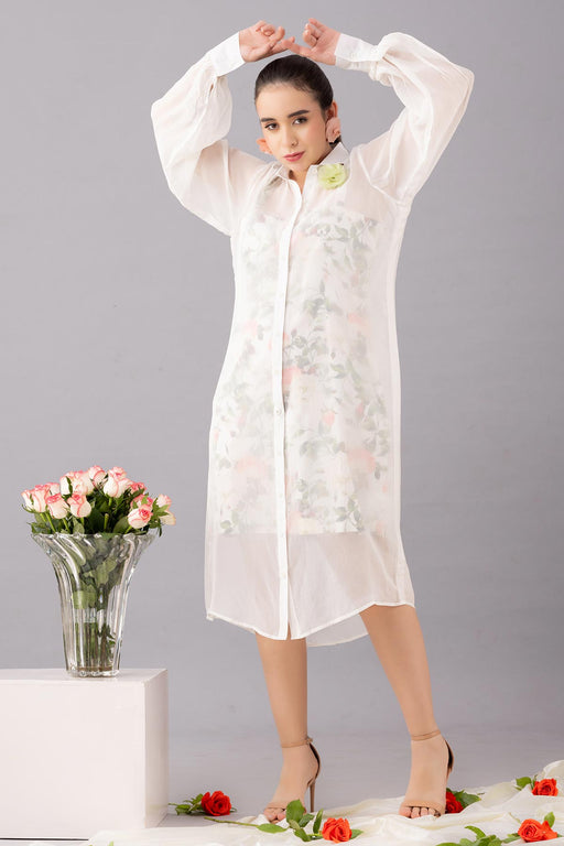 View full detailsThe organza shirt dress is a statement piece, featuring a front button closure, gathered cuff sleeves, and a shirt-style collar. The inner dress of...
