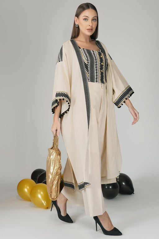 Kaftan flowy georgette cape embellished with white thread and gold sequence embroidery. Finished with ruffles at the bottom. Cropped spaghetti top,...