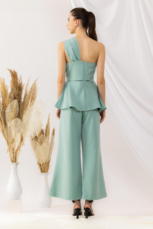 Featuring sea green one shoulder peplum top with embellished diamante around the neckline comes with flared pant in banana crepe. This pant has fix...
