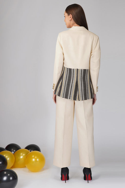 Featuring single button blazer with side flap pockets in banana crepe. Highlighted with crystal buttons and Brooch