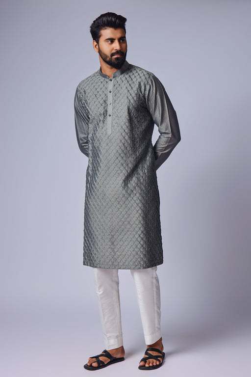 Grey Pintux Kurta Fabric: Kurta + Pyjama - Cotton Silk Fit: Relaxed No. of components: 2 Wash Care: Dryclean Delivery Time: 10 Days
