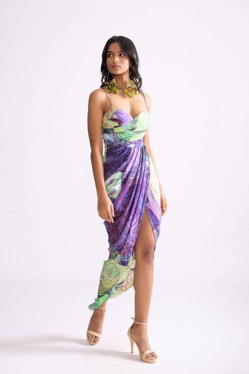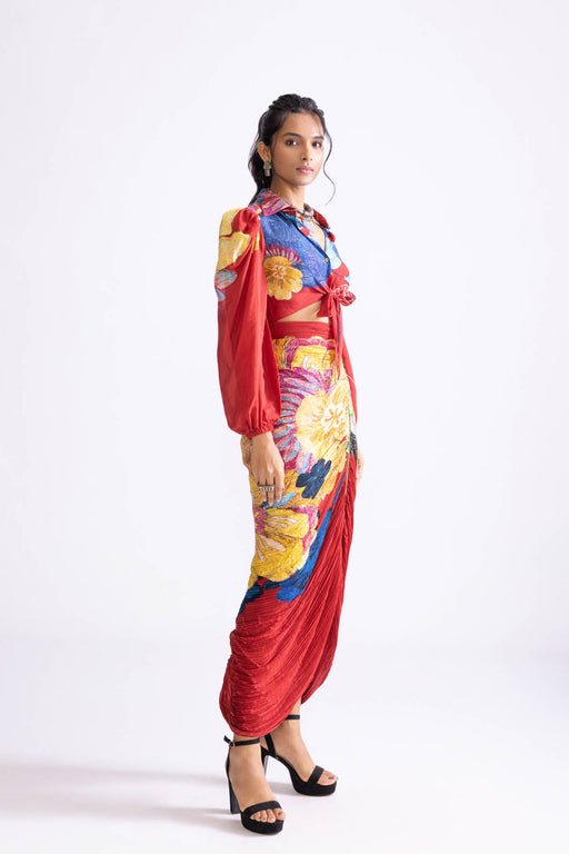 Bodysuit : Abstract floral print, sweetheart neckline, hand micro pleat body suit Skirt : High waist, asymmetric maxi wrap skirt with pinch and f...