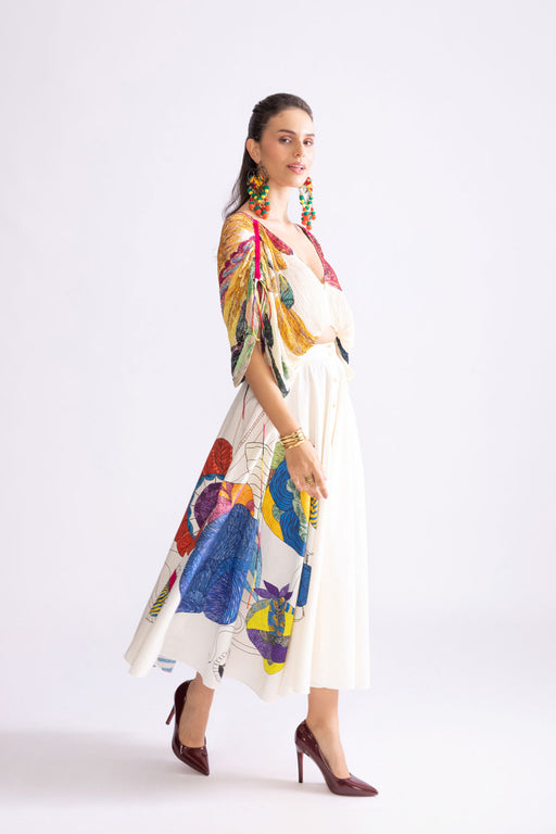 Skirt : Tribal Placement Print, High Waist, Flared Midi Skirt Ivory Gond Placement Skirt