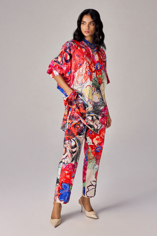 View full detailsTunic : Abstract floral print, asymmetric collared tunic Trousers : Abstract floral print, high waist trousers