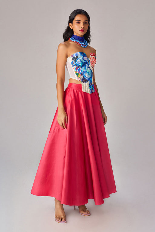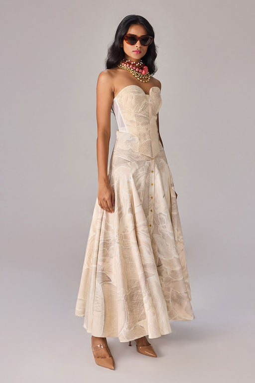 View full detailsCorset : Abstract floral print strapless, asymetric corset with quilting detailing Skirt : High waist flared and pleated maxi skirt