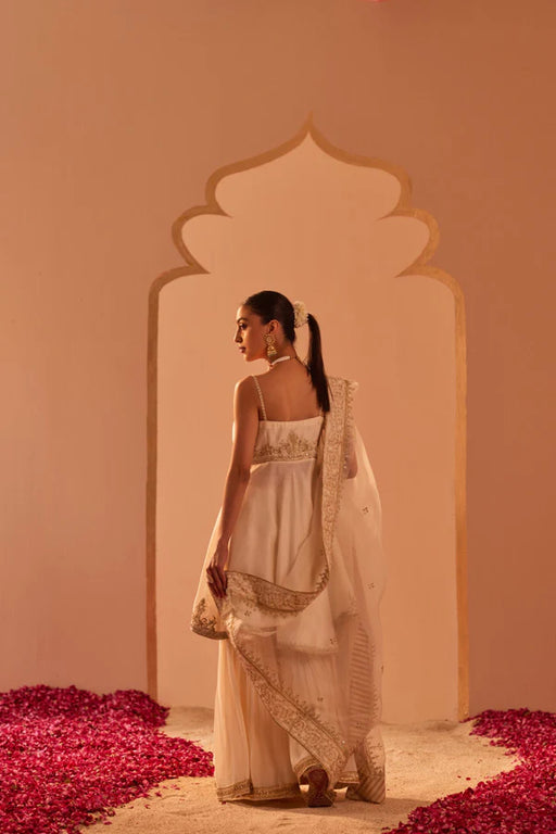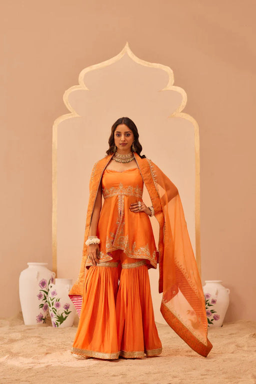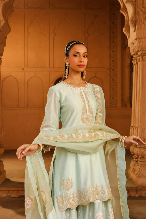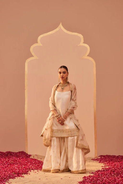 The short straight kurta set is made in pure silk chanderi and teamed up with a silk organza dupatta. The kurta is having a zero neck with placket ...