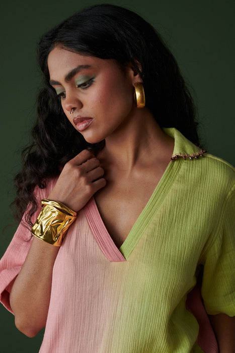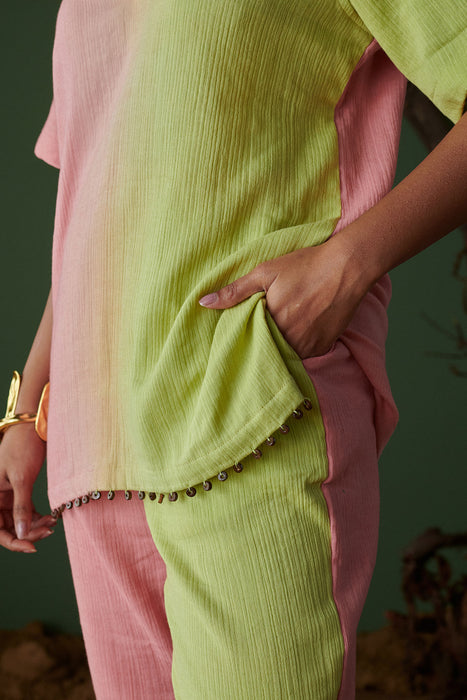 Our Barfi Bloom Co-ord, hand-dyed in soft pink and green, features playful detailing with chic button accents. Crafted in a skin loving fabric, this relaxed-fit set adds a burst of childhood colours to the days when you want to hit "pause" on adulting