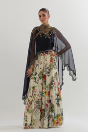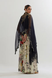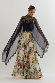 ORGANZA DUPATTA CAPE PAIRED WITH STRETCH INNER AND BOTANICAL PRINTED SHARARA