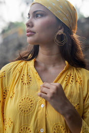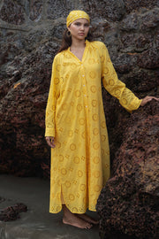 The cosy dress is made from hakoba embroidered fabrication & azo free dyed. It has gather detailing at the neck and its anti fit pattern makes it a perfect lounge wear.