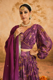 Elevate your style with our Magenta Cocktail Lehenga Set, a fusion of traditional charm and modern sophistication. Crafted from shimmering lurex, the lehenga skirt and blouse feature a timeless floral chintz print.