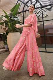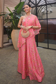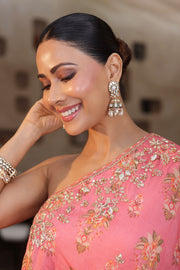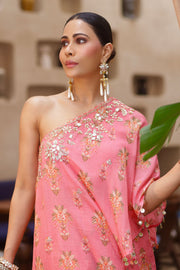 The outfit in the image is a stunning pink ensemble featuring a one-shoulder top adorned with intricate gold embroidery and matching flared pants. The vibrant color and elegant design make it perfect for festive occasions or elegant gatherings, beautifully complemented by traditional accessories.