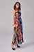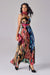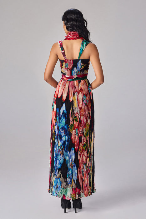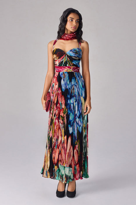 Floral print, hand micro pleat maxi dress with sweetheart neckline and waist band detailing