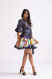 Wrap Style Collared Mini Dress With Tribal Print Placement, Balloon Tie Up Sleeves And Detachable Belt