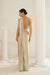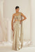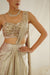 Kapda Dori's stunning gold ready to wear sandwash satin saree. The Gold color adds a touch of glamour and sophistication to your look, while the soft satin fabric ensures you feel comfortable all day or night long. It is styled with a gold net blouse fully embroidered with cutdana, stones and sequins.