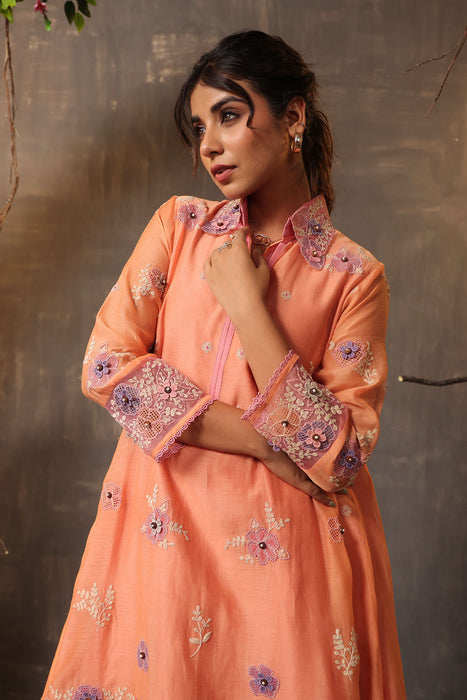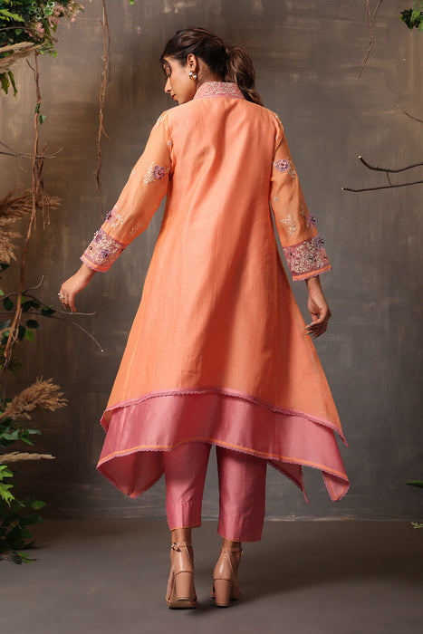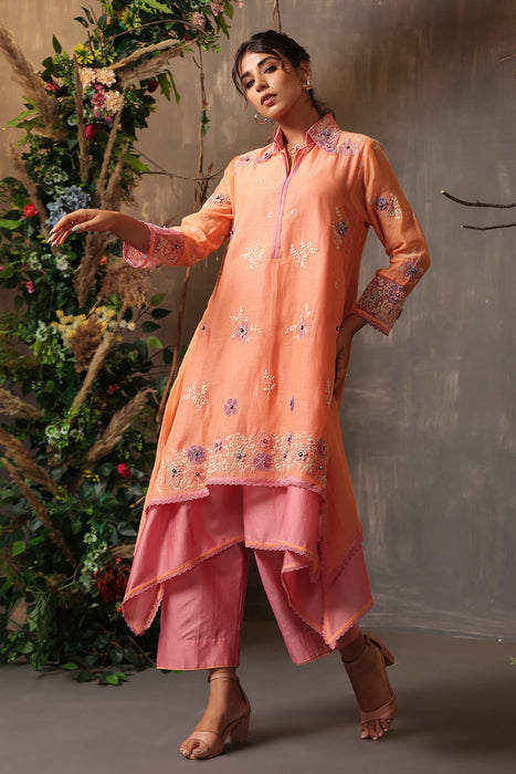 This 2pc Layered kurta set is enhanced with scattered applique and cut work embroidery all over . It is paired along with narrow pants .