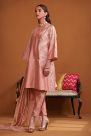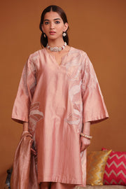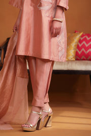 Featuring our Nude Pink Short Kurta set with oversized floral motifs set in fine embroidery and delicate applique patch work. The Short A-Line flowy silhouette ensures comfort and ease paired with tonal ankle length trousers with box pleat finish at hem and a co-ordinated Tonal Dupatta in Crushed Silk with contrast Organza Patch on the sides with hangings.