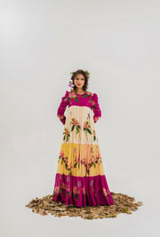 A floral multicolored long dress is a vibrant and lively garment that showcases a delightful array of colors and floral patterns. The dress features a flowing and flattering silhouette, usually reaching ankle length. The multicolored floral design adds a touch of playfulness and femininity, creating a cheerful and refreshing look. This dress is perfect for casual outings, garden parties, or summer events, exuding a carefree and bohemian vibe that effortlessly embraces the beauty of nature.
