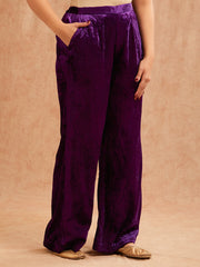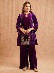 This elegant velvet anarkali set is crafted from premium imported velvet satin, offering a rich texture and luxurious fall. The top is beautifully enhanced with delicate hand-embroidered floral motifs scattered across the front, while the intricately embroidered hemline adds depth and festive richness to the design. Featuring a relaxed straight-cut silhouette with soft 3/4th sleeves, the top is finished with a scalloped V neckline that lends a graceful, feminine touch. Paired with matching straight-fit velvet pants, the ensemble exudes understated regal charm. The deep jewel-toned hue elevates the look, making it an ideal choice for festive gatherings and special occasions.