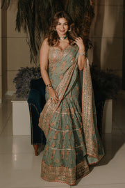 A delicate, floral jaal, layered frill saree with flounce ,flow and intricate embroidered border is a easy wrap, The classic sleeveless printed blouse adds glamour and glitz to the ensemble.