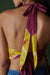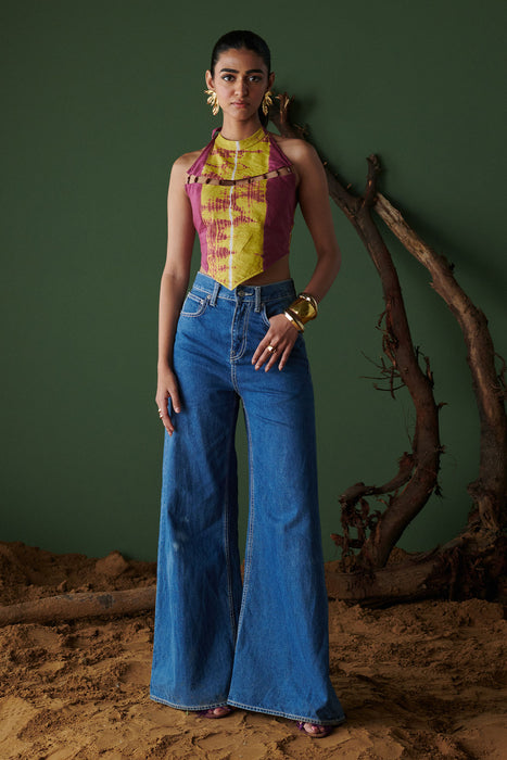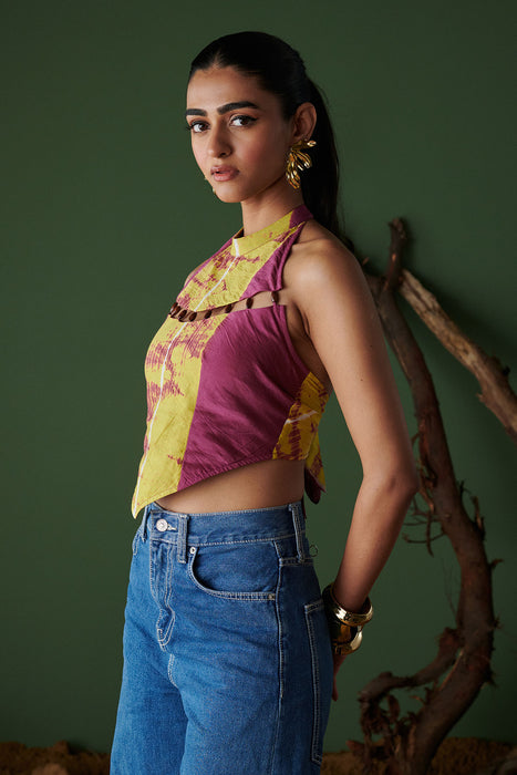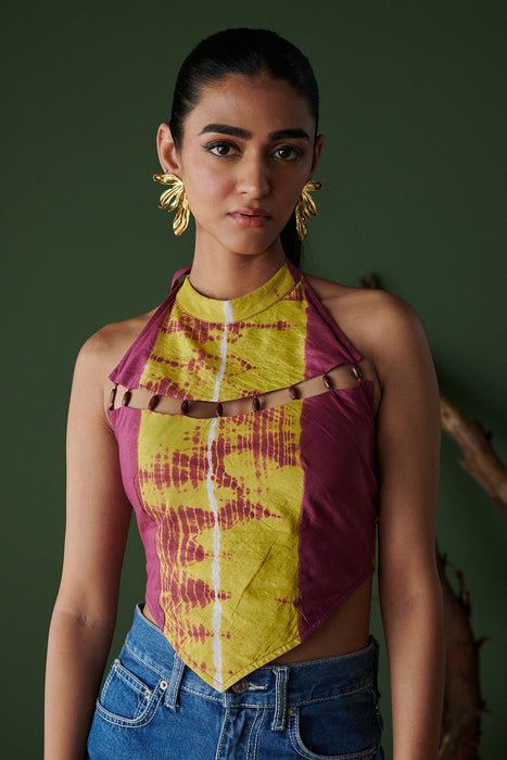 The Meetha Jaljeera Top is a vibrant halter-style piece, with cut-out accents. Hand-dyed in wine and deep yellow, it blends traditional craftsmanship with a modern silhouette, perfect for those who cherish both 'then' and 'now'