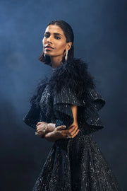 Midnight Blue drizzle embroidery Skirt, with elegantly sculpted sleeves, having dramatic feather details on the shoulders