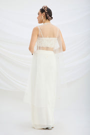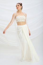 OFF WHITE EMBROIDERED JACKET WITH DRAPE SKIRT AND EMBROIDERED CROP TOP