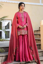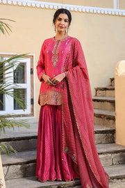 This 3 piece printed sharara set comes with heavily hand embroidered zardosi, pearl and squins embroidered neckline, sleeves and hem of the kurta and sharara. It is paired with leheriya organza dupatta with zardosi butis spread all over enhanced with hand embroidered tikki hangings and tassels.