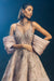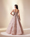 Rose gold cloudart gown having elegant, deep neckline, accentuated with gleaming rhythmic embroidery